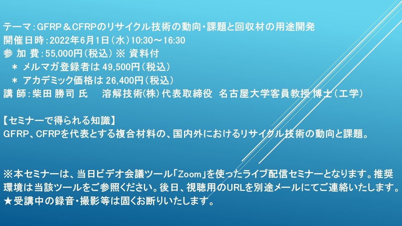 先端技術情報や市場情報を提供している(株)シーエムシー・リサーチ(千代田区神田錦町: https://cmcre.com/ )では、 各種材料・化学品などの市場動向・技術動向のセミナーや書籍発行を行っておりますが、 このたび「GFRP&CFRPのリサイクル技術の動向・課題と回収材の用途開発」と題するセミナーを、 講師に柴田 勝司 氏 溶解技術(株) 代表取締役 名古屋大学客員教授 博士(工学))をお迎えし、2022年6月1日(水)10:30より、 ZOOMを利用したライブ配信で開催いたします。 受講料は、 一般:55,000円(税込)、 弊社メルマガ会員:49,500円(税込)、 アカデミック価格は26,400円(税込)となっております(資料付)。