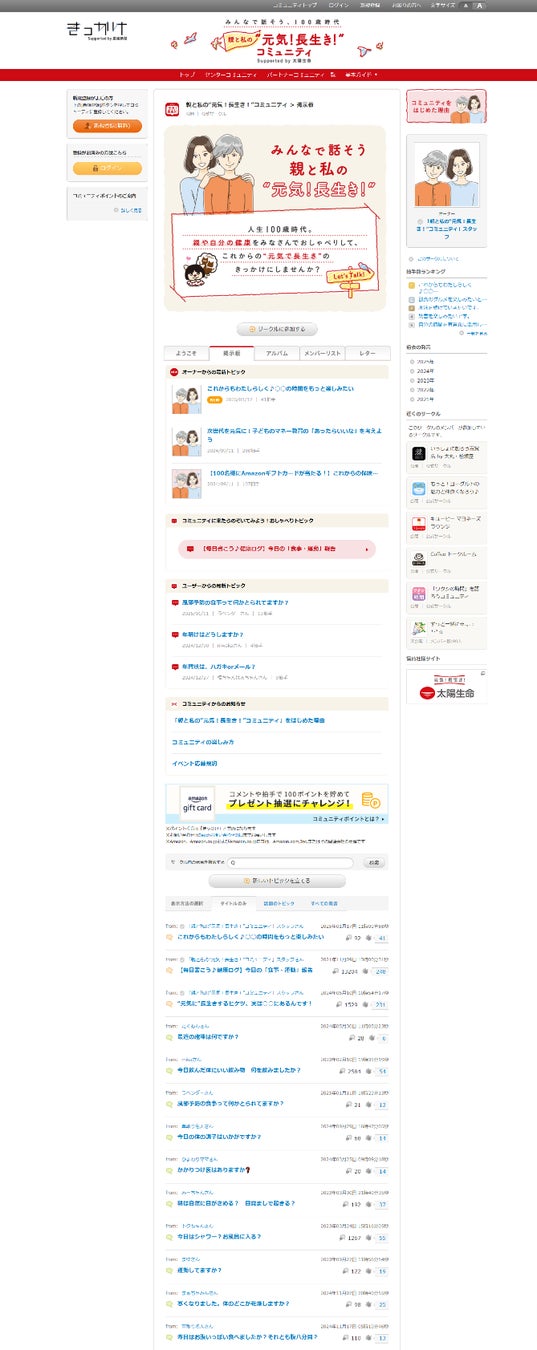 本コミュニティは、幅広い世代が健康について語り合う場であると同時に、協賛社である太陽生命保険が日本の「元気!長生き!」を支えていること、また、それにまつわる同社のさまざまな取り組みへの理解促進を目的に運営しております。