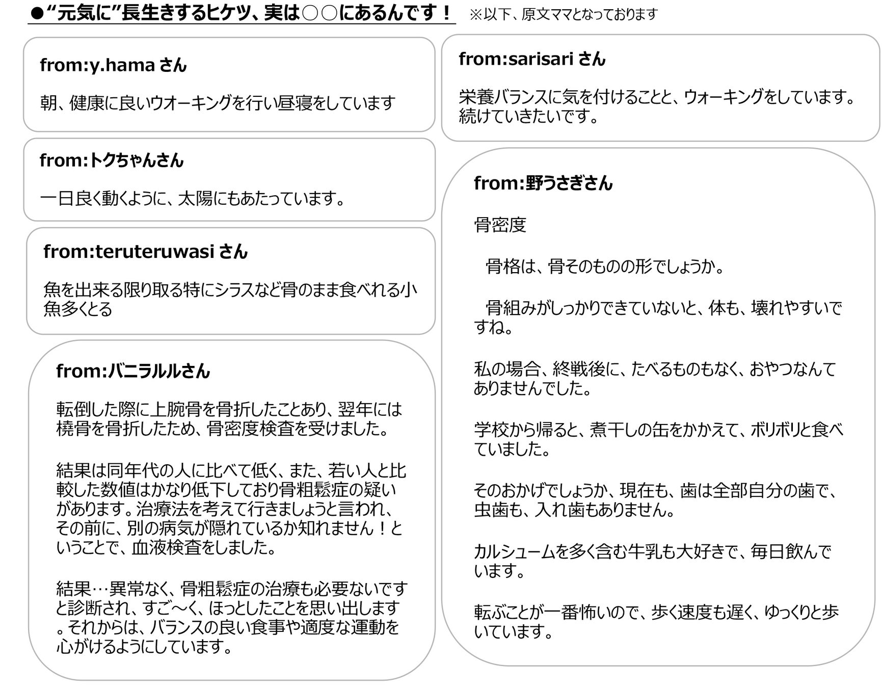 ユーザーは自分や親の生活習慣や、病気、困りごとなどの経験を率直に語っており、中でも、骨の健康について考えたことや、日頃から実践していることを語り合うテーマ「“元気に”長生きするヒケツ、実は○○にあるんです!」(※1)には1,500件以上と、非常に多くのコメントが寄せられました。