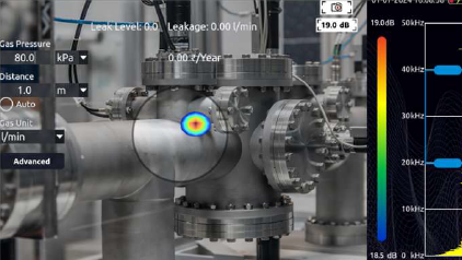 配管やバルブからのエア漏れ、ガス漏れを検知するカメラ。高性能マイクを搭載し、ガス・エア漏れや電気設備の部分放電を高精度で検知。画面上にカラーマッピングし、リーク箇所を迅速に特定します。サーマルカメラや接触式センサーも追加可能。設備診断を効率化し、異常を見逃しません。