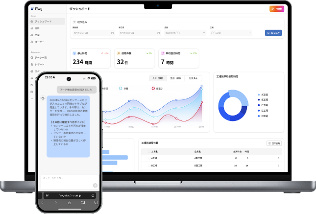 現場の設備トラブルをサポートするAIチャットボット。過去の修理履歴や故障データをもとに、類似事例の検索、故障診断のガイド提示、再発リスク抽出まで対話形式で提供します。今まで眠っていた保全データを「すぐに直せる力」と「未然に防ぐ力」に変えます。