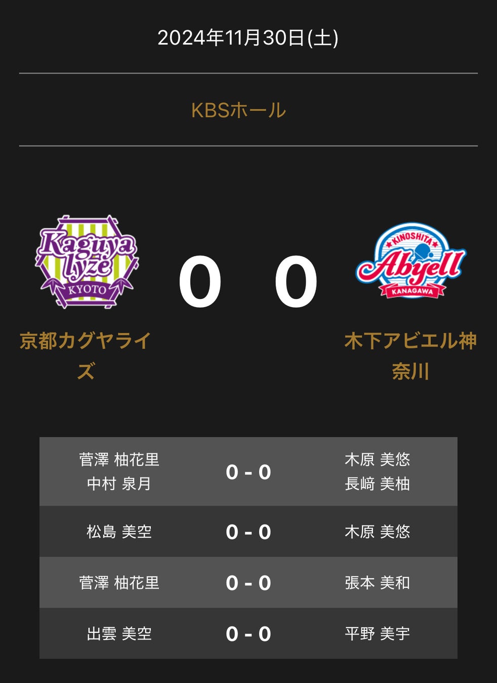 ノジマTリーグ 2024-2025シーズン 公式戦 11月30日開催 京都カグヤライズ vs 木下アビエル神奈川 対戦オーダー発表