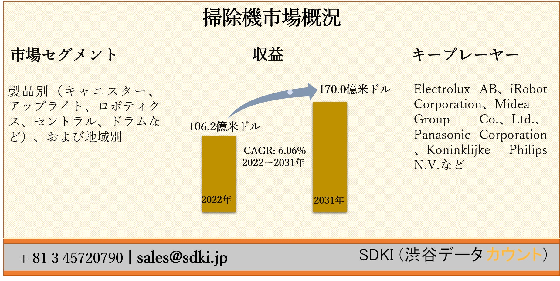掃除機市場は、2022年に106.2億米ドルの市場価値から、2031年までに170.0億米ドルに達すると推定され、2022-2031年の予測期間中に6.06%のCAGRで成長すると予想されています。