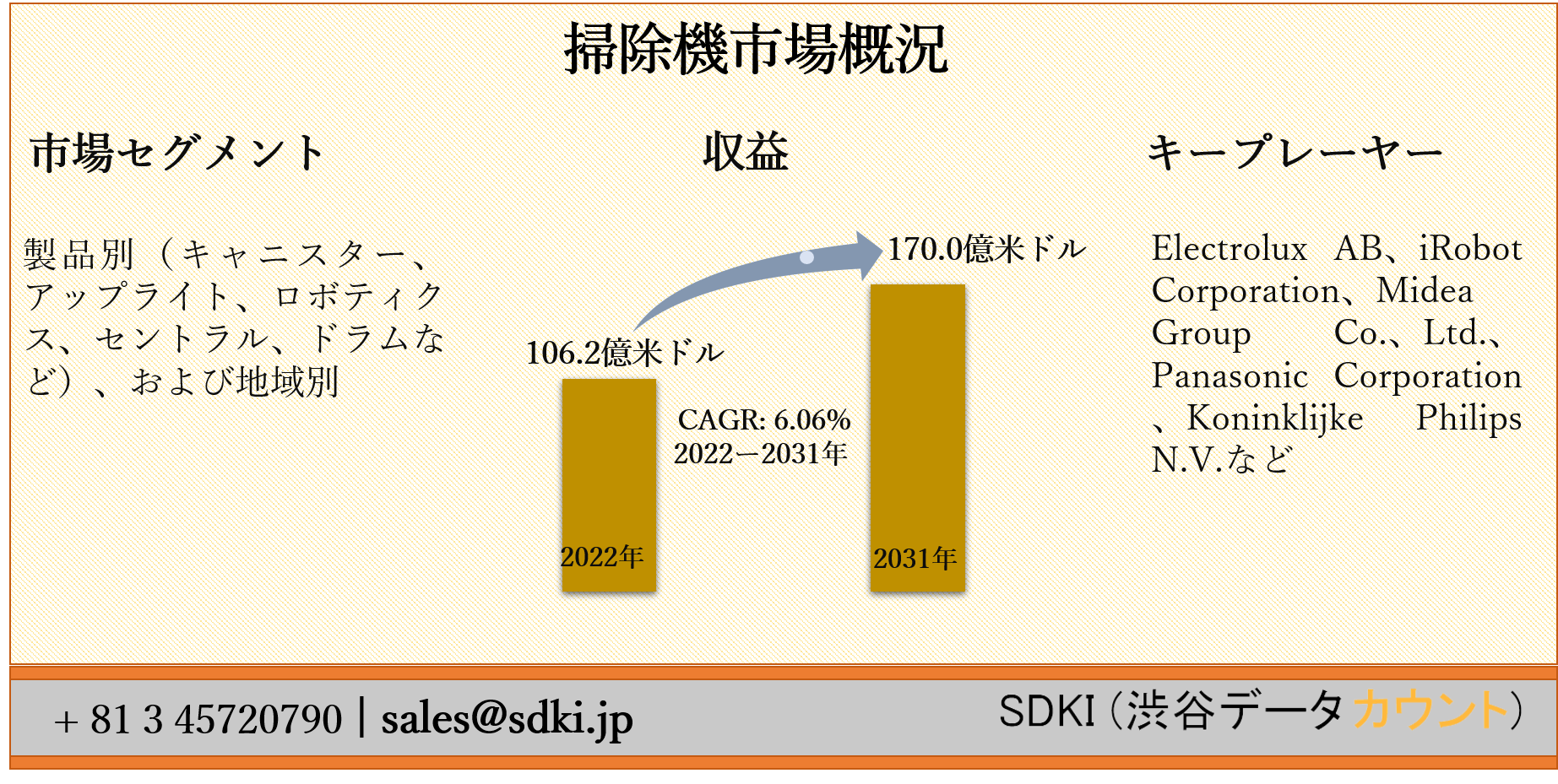 SDKI Inc.は、「世界の掃除機市場ー予測2022ー2031年」新レポートを 2022年02月01日に発刊しました。この調査には、掃除機市場の成長に必要な統計的および分析的アプローチが含まれています。レポートで提供される主要な産業の洞察は、市場の既存のシナリオに関する読者に市場の概要についてのより良いアイデアを提供します。さらに、レポートには、市場の成長に関連する現在および将来の市場動向に関する詳細な議論が含まれています。