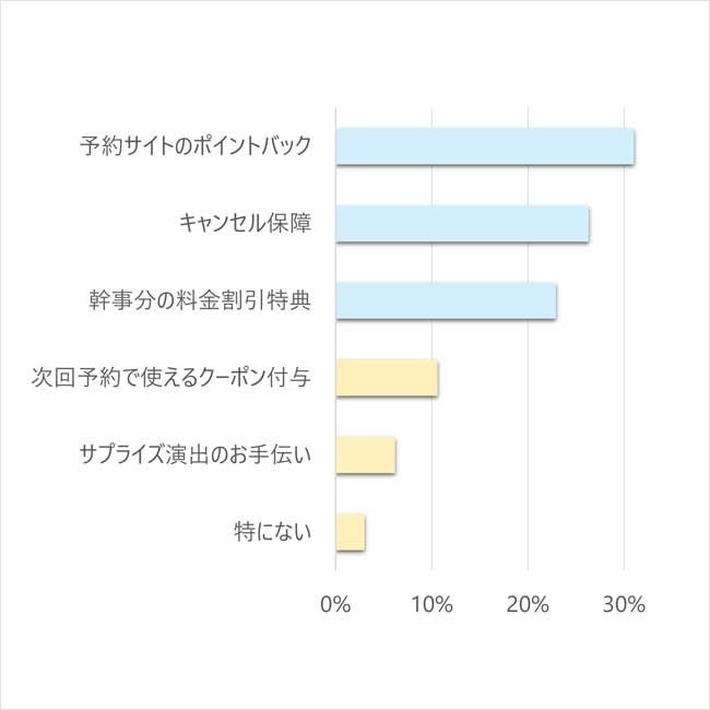 「予約ポイントバック」「料金割引」「クーポン付与」といった幹事自身に対する嬉しいサービスがあれば、ネガティブな幹事役も引き受けてみたいとの回答が多く見受けられた。通常業務以外に時間を取られるため、努力に対しての個人的な報酬を求めていることも推測できる。また、「キャンセル保障(26.3%)」が2番目に多い回答となり、急な欠席の調整が幹事を担ううえでのストレス要因になっていることが明らかに。予期せぬトラブルを軽減できれば、安心して役割を引き受けられると言えそう。
