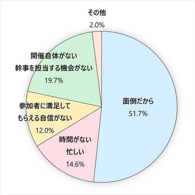 最も多かったのは「面倒だから」という回答で、全体の51.7%を占めた。次いで、「時間がない・忙しい(14.6%)」や「参加者に満足してもらえる自信がない(12.0%)」という回答が多かった。幹事業務が時間と労力を要するわりに「感謝されにくい」といった不安が、幹事役を避けたがる大きな理由として考えられる。また、そもそも「開催自体がない・幹事を担当する機会がない(19.7%)」といった回答も。コロナ禍やリモートワークの影響で、大人数の宴会自体が減少している現状も反映されていそう。