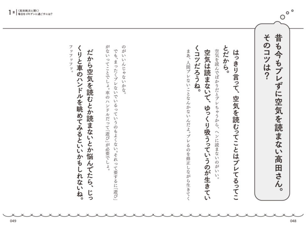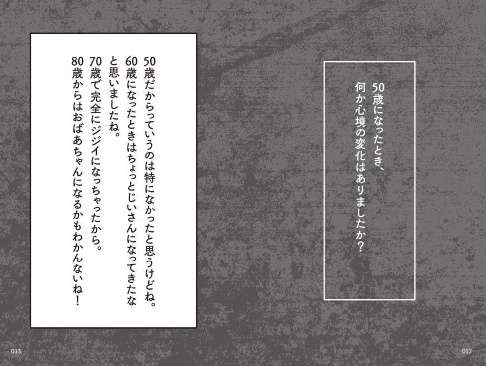 では本人は50歳の頃に何を考えていたのかといえば、次のようになります。「50歳だからっていうのは特になかったと思うけどね。60歳になったときはちょっとじいさんになってきたなと思いましたね。70歳で完全にジジイになっちゃったから。80歳からはおばあちゃんになるかもわかんないね!」。これでいいんです。あと、今も昔も裏表のないテキトーな高田さん。ずっとブレないコツを聞くと、「はっきり言って、空気を読むってことはブレてるってことだから。空気を読んでばかりだとブレちゃうから、変に読まないのがいい。空気は読まないで、ゆっくり吸うっていうのが生きていくコツだろうね」。意味がわからないけれど、とにかくゴキゲンになることは間違いありません。