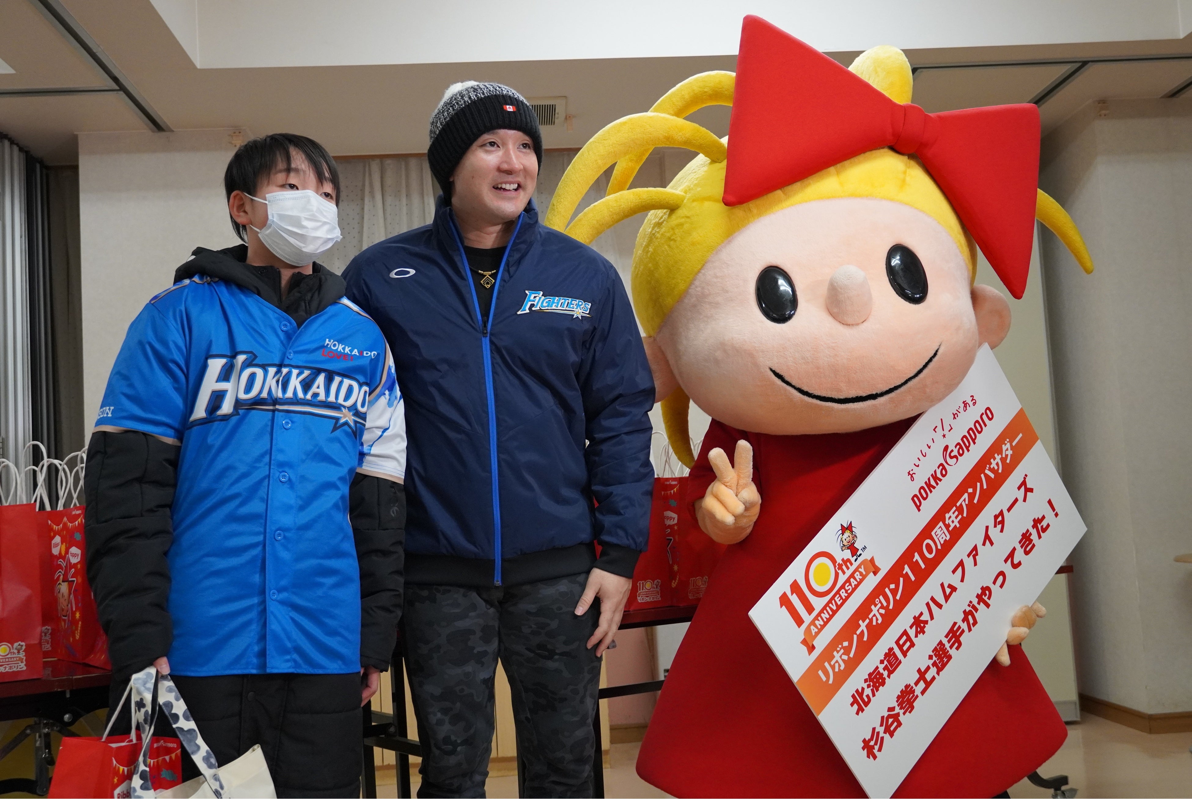 また、サプライズプレゼンターとして北海道札幌市手稲区「こども食堂ぐれーす」に、北海道日本ハムファイターズ 杉谷拳士選手が特別訪問し、リボンちゃんと一緒に、子どもたちに直接プレゼントを渡しました。