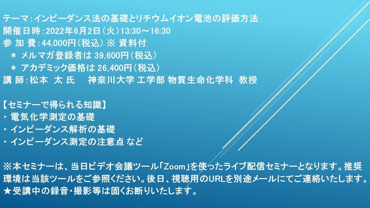 先端技術情報や市場情報を提供している(株)シーエムシー・リサーチ(千代田区神田錦町: https://cmcre.com/ )では、 各種材料・化学品などの市場動向・技術動向のセミナーや書籍発行を行っておりますが、 このたび「インピーダンス法の基礎とリチウムイオン電池の評価方法」と題するセミナーを、 講師に松本 太 氏 神奈川大学 工学部 物質生命化学科 教授)をお迎えし、2022年6月2日(木)13:30より、 ZOOMを利用したライブ配信で開催いたします。 受講料は、 一般:44,000円(税込)、 弊社メルマガ会員:39,600円(税込)、 アカデミック価格は26,400円(税込)となっております(資料付)。
