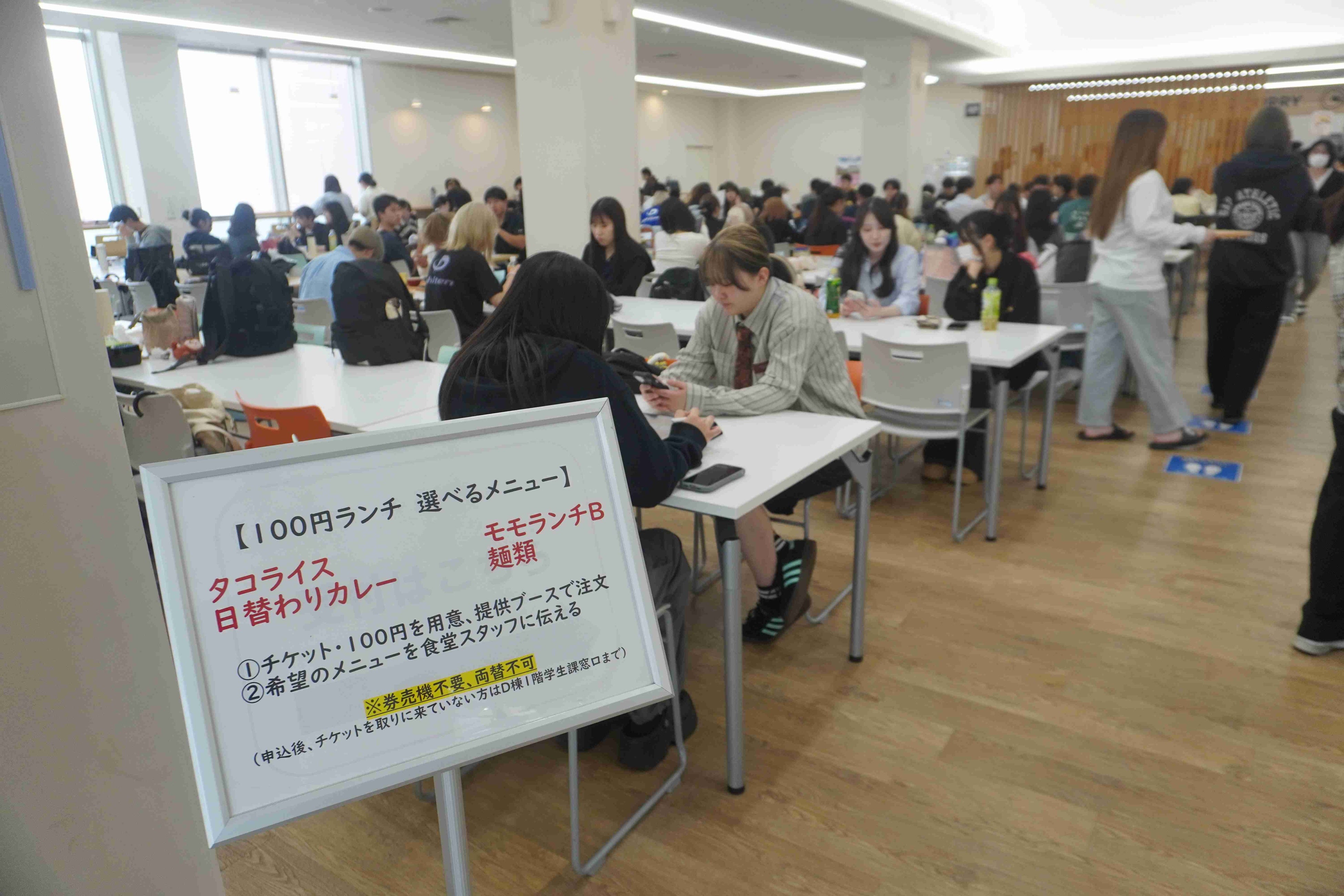 本企画は、独立行政法人日本学生支援機構の助成金および、学食運営企業である株式会社日本フードリンク様のご協力により実現したものです。通常500円程度のランチを100円で提供し、物価高騰の影響を受ける学生の生活を経済的に支援することを目的としています。