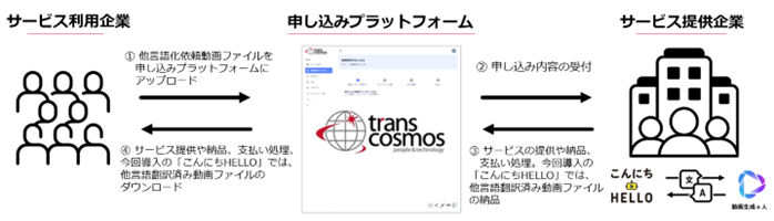 トランスコスモスは、BtoB向けサービスを提供する企業向けに、利用企業が簡単にサービスの申し込みを行えるプラットフォームを開発しました。本プラットフォームにより、サービス利用企業はスムーズに利用したいサービスを申し込むことが可能となり、サービス提供企業は、プラットフォーム上でサービス提供や納品、請求までを管理することが可能となります。2025年1月に日本語動画を他言語に翻訳する動画翻訳サービスを提供する株式会社こんにちハロー(本社:東京都中央区、代表取締役CEO:早見星吾、以下、こんにちハロー)に本プラットフォームを導入しています。