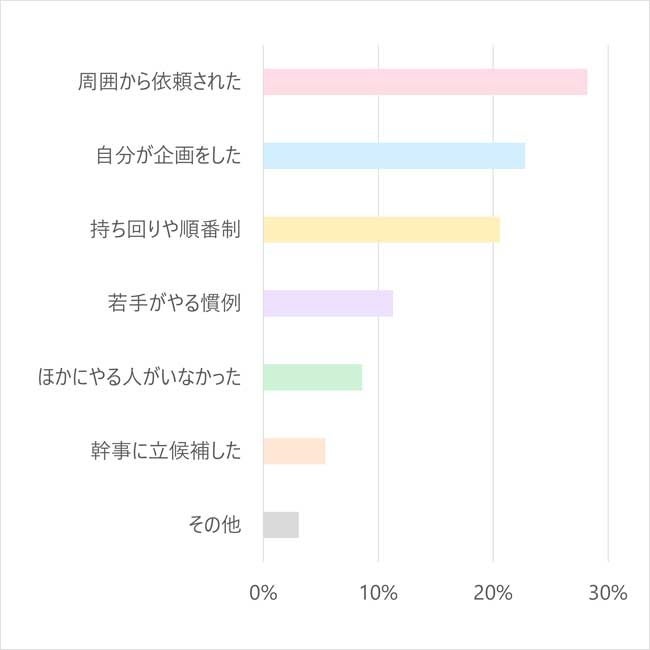 最多回答の「周囲から依頼された(28.2%)」や、「持ち回りや順番制(20.6%)」、「若手がやる慣例(11.3%)」の理由が約6割を占め、幹事は周囲からの依頼や組織の慣例によって選ばれることが多いと言える。「ほかにやる人がいなかった(8.6%)」といった回答もあり、やむを得ず幹事を引き受けているケースも少なくなさそう。また、その他のフリーコメントの中には、「総務部・経理部の仕事だから」、「PTA役員だったから」といった理由も挙がっていた。一方で、「自分が企画をした(22.8%)」や「幹事に立候補した(5.4%)」といった自発的に幹事役を担う人も一定数存在。