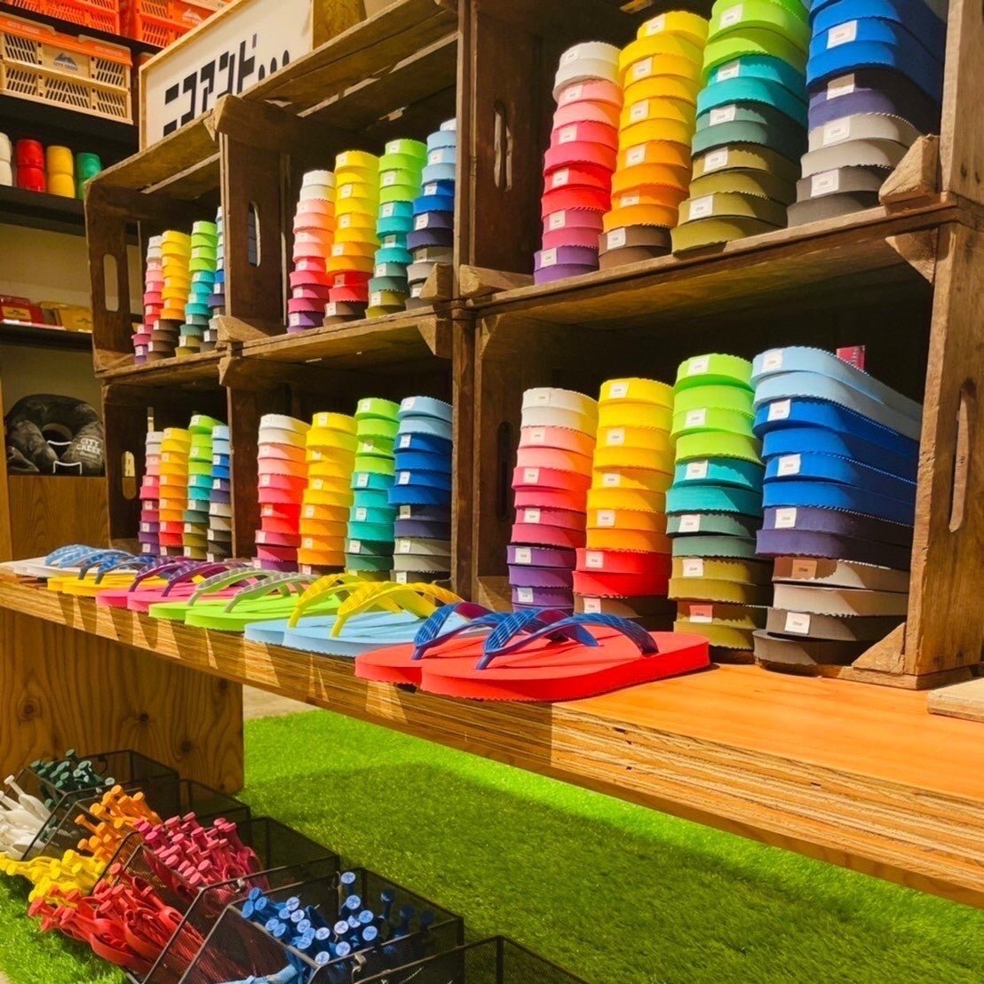 日本唯一のビーチサンダルブランド「九十九サンダル」のオリジナルビーチサンダルづくりのワークショップを開催します。ベースカラー19色と鼻緒12色、サイズは23.24.25.26.27cmの5サイズからカスタムできます。ご予約不要のため、お近くのスタッフまでお声かけください。