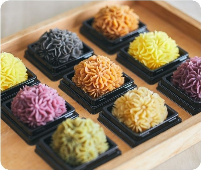 まるでお花が咲いたようなビジュアルのかわいらしいおはぎは、和栗、抹茶、黒ごま、スイートポテト、紫芋、きなこと6種類の餡をご用意。