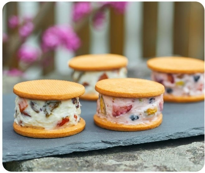右)ドライフルーツやナッツをチーズに混ぜ、冷凍して固めたシチリアの伝統的なスイーツ“カッサータ”をアレンジ。クリームチーズに自家製のドライフルーツをたっぷり混ぜ、クッキーでサンドしました。半解凍でお召し上がりください。