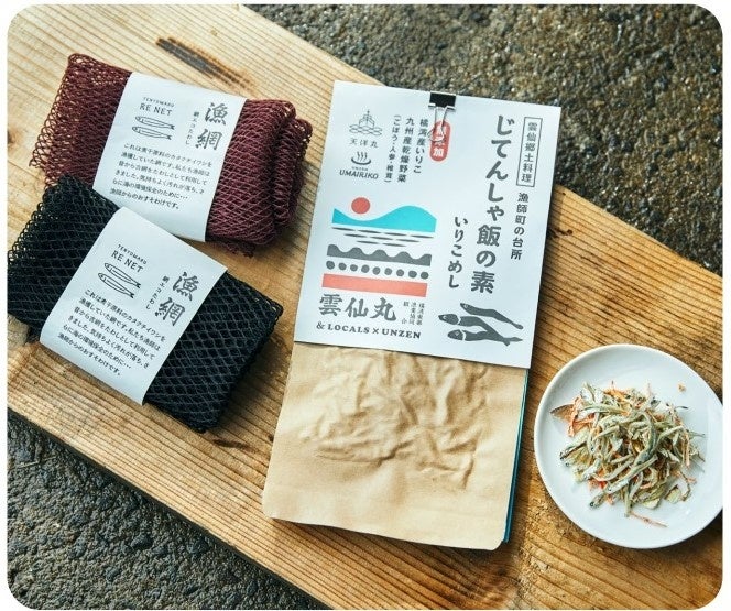 左)カエリイリコ(赤ちゃん煮干し)と、九州産の人参・牛蒡・椎茸が入った炊き込みご飯は、昔からこの地で愛される郷土飯。 昭和2年、自転車競技会が行われた際、沿道に多くの 応援団が駆けつけました。その時に、漁師町で常備食だったイリコを醤油で炊き込んだご飯をおにぎりにして振舞ったことで、“じてんしゃ飯”という名がつきました。『自転車が走るように素早く作れる』じてんしゃ飯 は、今でも漁師町で愛される地元めしです。 もうひとつご紹介するのは、まき網漁に10年ほど使用していた網をカットし、洗浄・殺菌して作った“漁網エコたわし”。出漁をしない期間に網の破れを繕い、大切に使用した網。そんな網をまだまだ役立たせたいとの思いから生まれました。昔から漁師には重宝されており、少しの洗剤で泡立ち、汚れがすぐ落ちて、乾きやすく、清潔に保てます。