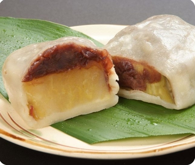 さつま芋の上に甘さ控えめの粒あんをのせ、もっちり食感のうす皮の団子で包んで蒸した郷土菓子。 熊本で長く親しまれてきたおいしさです。