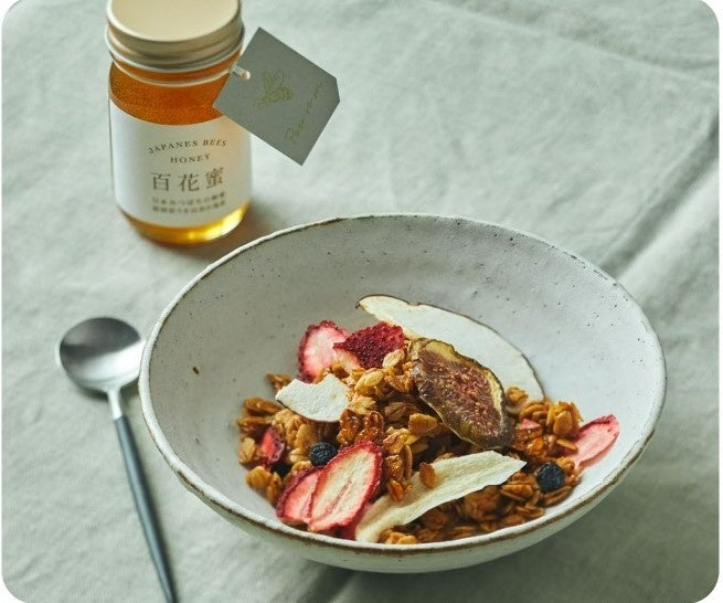 右)オートミールに日本ミツバチのはちみつを絡めて。大きめにカットしたいちじく“とよみつひめ”やりんご、いちご、ブルーベリーのドライフルーツと一緒に。丸2日間かけてじっくりと乾燥させたフルーツは、甘みが凝縮されています。年に1度しか採蜜できない日本ミツバチのはちみつとの相性もよく、ヨーグルトとともに。
