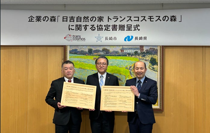 この度、トランスコスモス社と日吉自然の家の「トランスコスモスの森」に関する協定書を締結することができましたこと、大変うれしく思っております。また、トランスコスモス社におかれましては、長崎に立地いただきまして、既に雇用という形で長崎の地域に対して大きなご貢献をいただいております。そういったことに留まらず、さまざまな社会貢献に積極的に取り組んでいただき地域の活性化や発展にご貢献いただいていることに対しまして、心より御礼申し上げます。