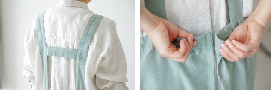 特徴的なH型の肩ひもは、肩からずれ落ちにくくストレスを軽減。またウエスト部分にはマグネットを採用しており、着脱が簡単で、腰リボンを結ぶ手間も省けます。