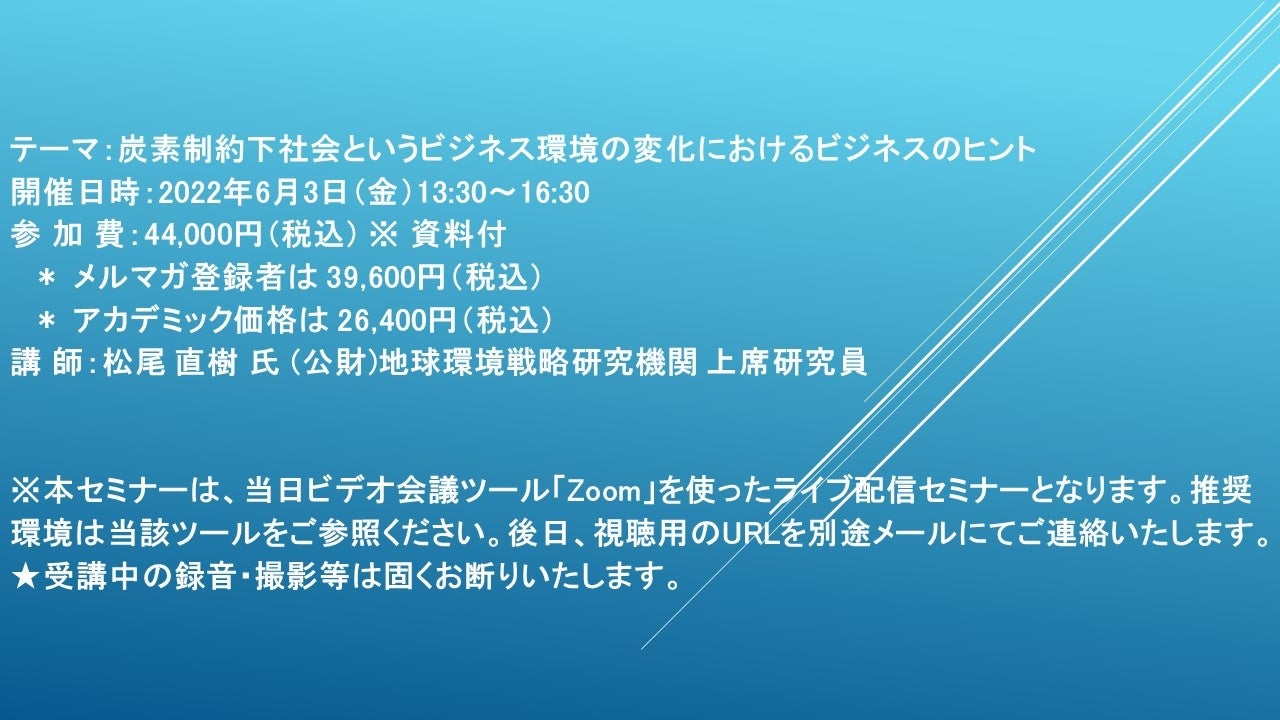 先端技術情報や市場情報を提供している(株)シーエムシー・リサーチ(千代田区神田錦町: https://cmcre.com/ )では、 各種材料・化学品などの市場動向・技術動向のセミナーや書籍発行を行っておりますが、 このたび「炭素制約下社会というビジネス環境の変化におけるビジネスのヒント」と題するセミナーを、 講師に松尾 直樹 氏 (公財)地球環境戦略研究機関 上席研究員)をお迎えし、2022年6月3日(金)13:30より、 ZOOMを利用したライブ配信で開催いたします。 受講料は、 一般:44,000円(税込)、 弊社メルマガ会員:39,600円(税込)、 アカデミック価格は26,400円(税込)となっております(資料付)。