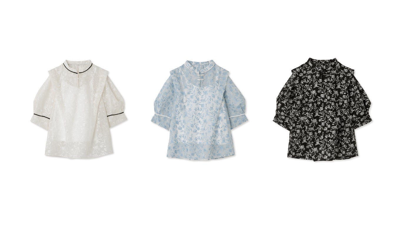 トップスの胸元のチャイナディテールでリリー ブラウンらしさを演出。