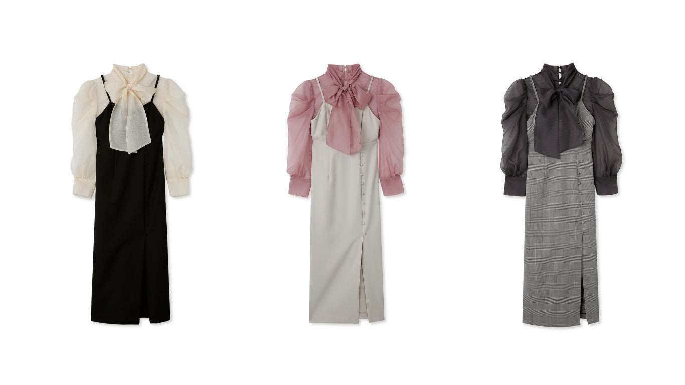 大ぶりなリボンタイが顔周りを華やかに見せるシースルートップスは、ブラックドレスでモードに引き締める。