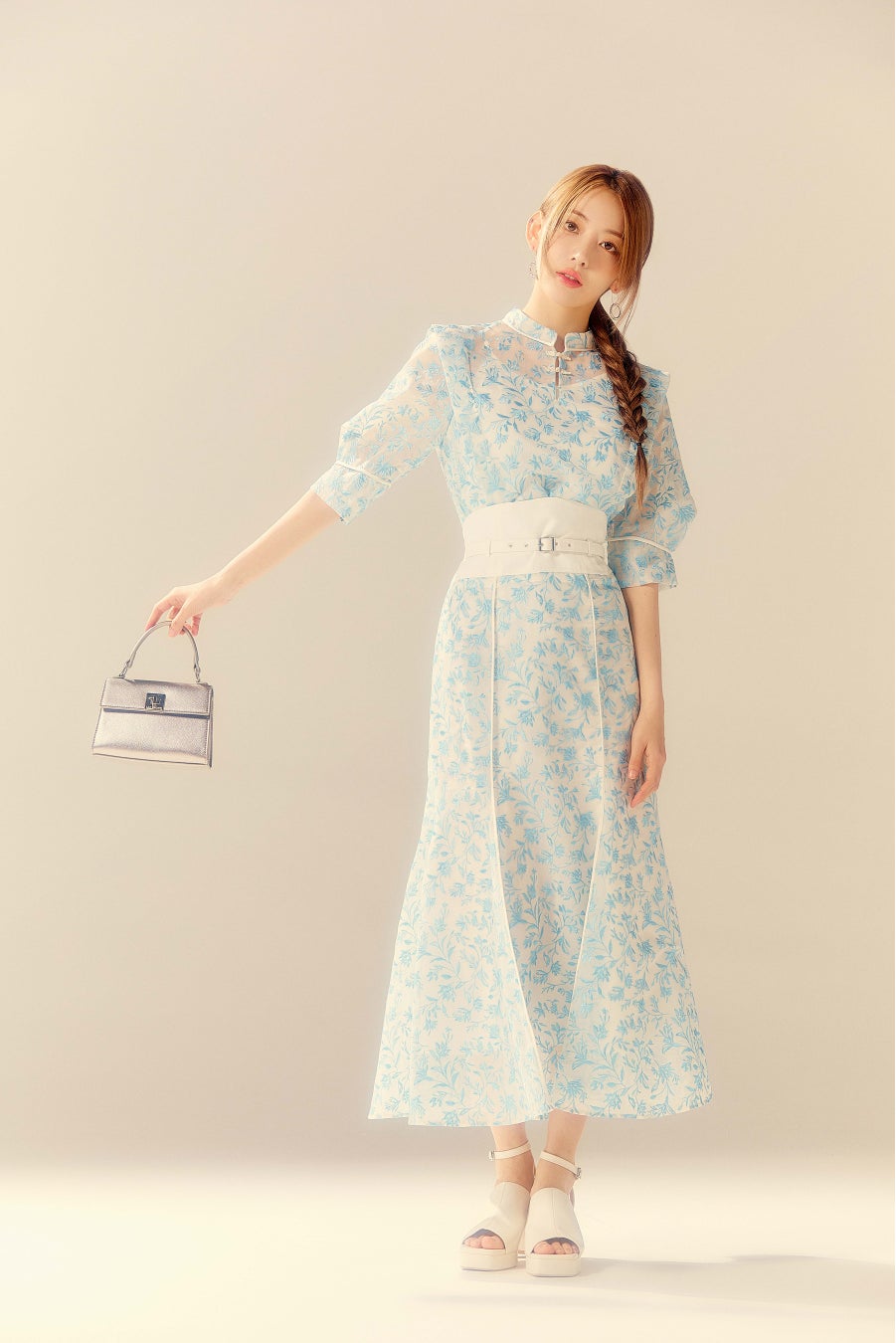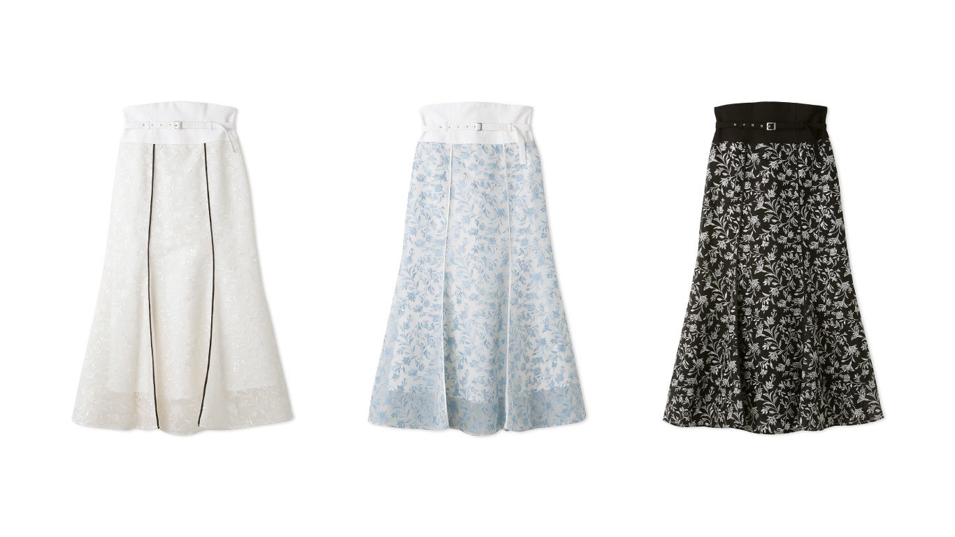 シアー素材に全面に施されたヴィンテージライクな花柄刺繍が視線を集めるセットアップ。