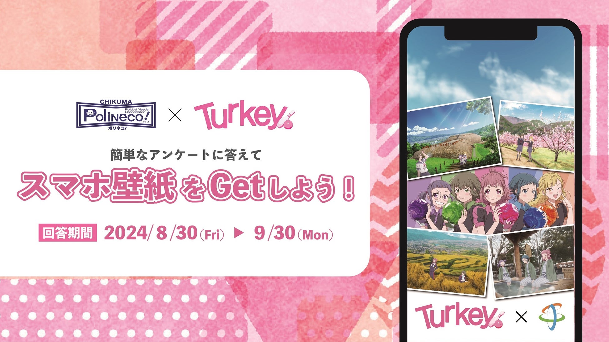 アンケートでは、簡単な質問にご回答いただくだけで、キャラクタータイプが判明!さらに回答者全員に「Turkey!」制作陣が千曲市オリジナルとして描き下ろした作品出演陣と千曲市の情景をフィーチャーしたオリジナル壁紙をプレゼントいたします。