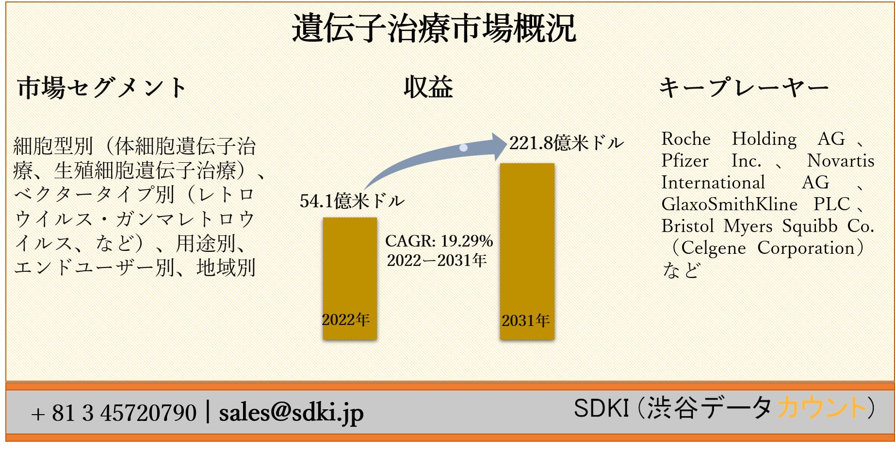 SDKI Inc.は、世界の遺伝子治療市場の新レポートを2022年02月01日に発刊しました。この調査には、遺伝子治療市場の成長に必要な統計的および分析的アプローチが含まれています。レポートで提供される主要な産業の洞察は、市場の既存のシナリオに関する読者に市場の概要についてのより良いアイデアを提供します。さらに、レポートには、市場の成長に関連する現在および将来の市場動向に関する詳細な議論が含まれています。