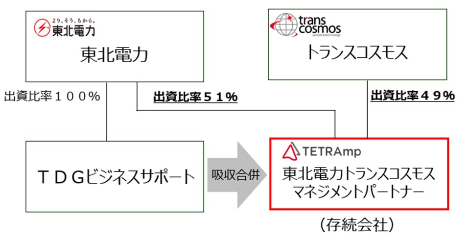東北電力株式会社(本店:宮城県仙台市、取締役社長 社長執行役員:樋󠄀口 康二郎、以下「東北電力」)とトランスコスモス株式会社(本社:東京都豊島区、代表取締役共同社長:牟田 正明、神谷 健志、以下「トランスコスモス」)は、両社の共同出資会社である「東北電力トランスコスモスマネジメントパートナー株式会社」(以下「TETRAmp」)と、東北電力の100%子会社である「TDGビジネスサポート株式会社」(以下「TDG」)の2社について、2025年4月1日付で合併することとし、本日、合併当事会社であるTETRAmpとTDGの間で吸収合併契約を締結いたしました。
