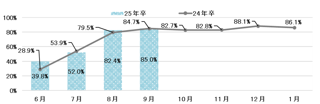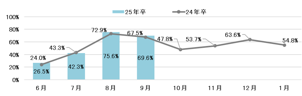 25年卒学生の9月単月のインターンシップ・仕事体験への参加割合は69.6%(前年比2.1pt増)、9月までの累計参加割合は85.0%(前年比0.3pt増)となり、いずれも前年を上回った。【図1、2】
