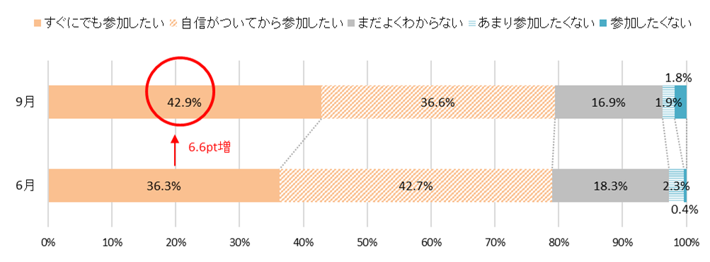参加した学生の情報を採用選考に利用するプログラムには「すぐにでも参加したい」が42.9%と最多で、6月調査から6.6pt増加【図5】