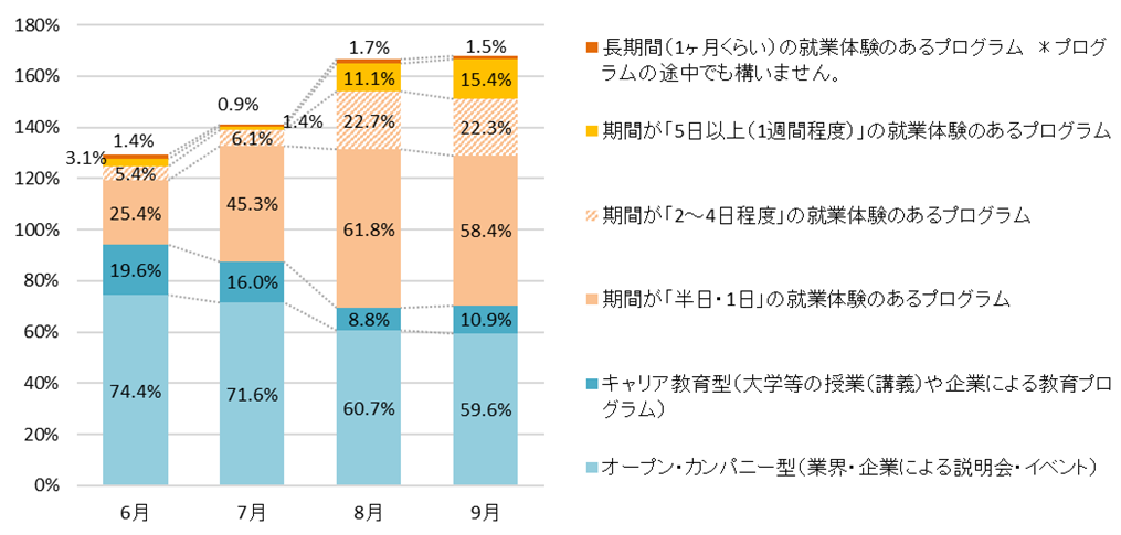 オープン・カンパニーやキャリア教育を含むキャリア形成支援活動について月ごとの参加状況を聞いたところ、就業体験を含むプログラムへの参加が徐々に増えていた。25年卒では「インターンシップ」という呼称を使うためには「5日以上」などの実施要件があるが、「期間が『5日以上(1週間程度)』の就業体験のあるプログラム」に注目してみると、全体としての割合は多くないものの、8月で11.1%、9月で15.4%となり、夏季休暇中は参加割合が増加していることがわかる。【図3】