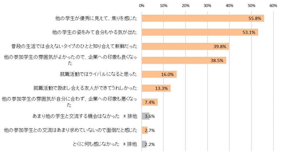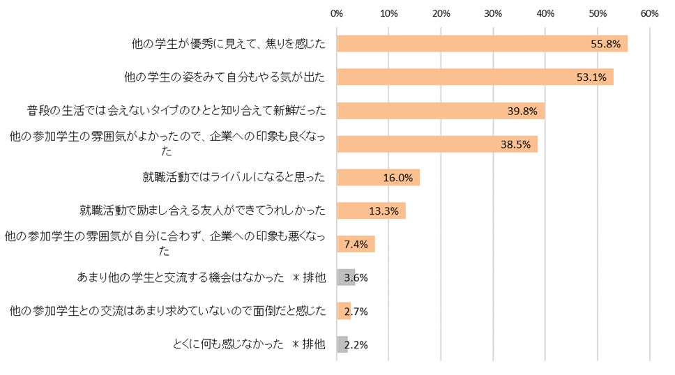 インターンシップ・仕事体験で他の学生と交流して感じたことは「他の学生が優秀に見えて、焦りを感じた」が最多で55.8%【図4】