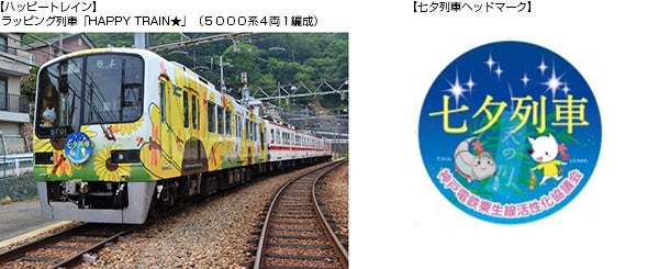 ラッピング列車「HAPPY TRAIN★」(5000系4両1編成)に「七夕列車」のヘッドマークを掲出し、また、車内に園児の願い事やメッセージが書かれた短冊を貼付したポスターを展示します。