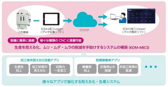 「KOM-MICS」は、工場の生産性改善を支援するクラウド型システムです。生産現場のノウハウから生まれた本システムは、工作機械の稼働状況をクラウド上に収集し、さまざまな視点での可視化を通じて課題の発見に導き、改善の実施までを支援します。単なる「見える化」にとどまらず、現場で頻発する課題に対して、具体的な改善活動につながる分析・管理機能を搭載しており、製造現場の継続的な改善と安定稼働を後押しします。