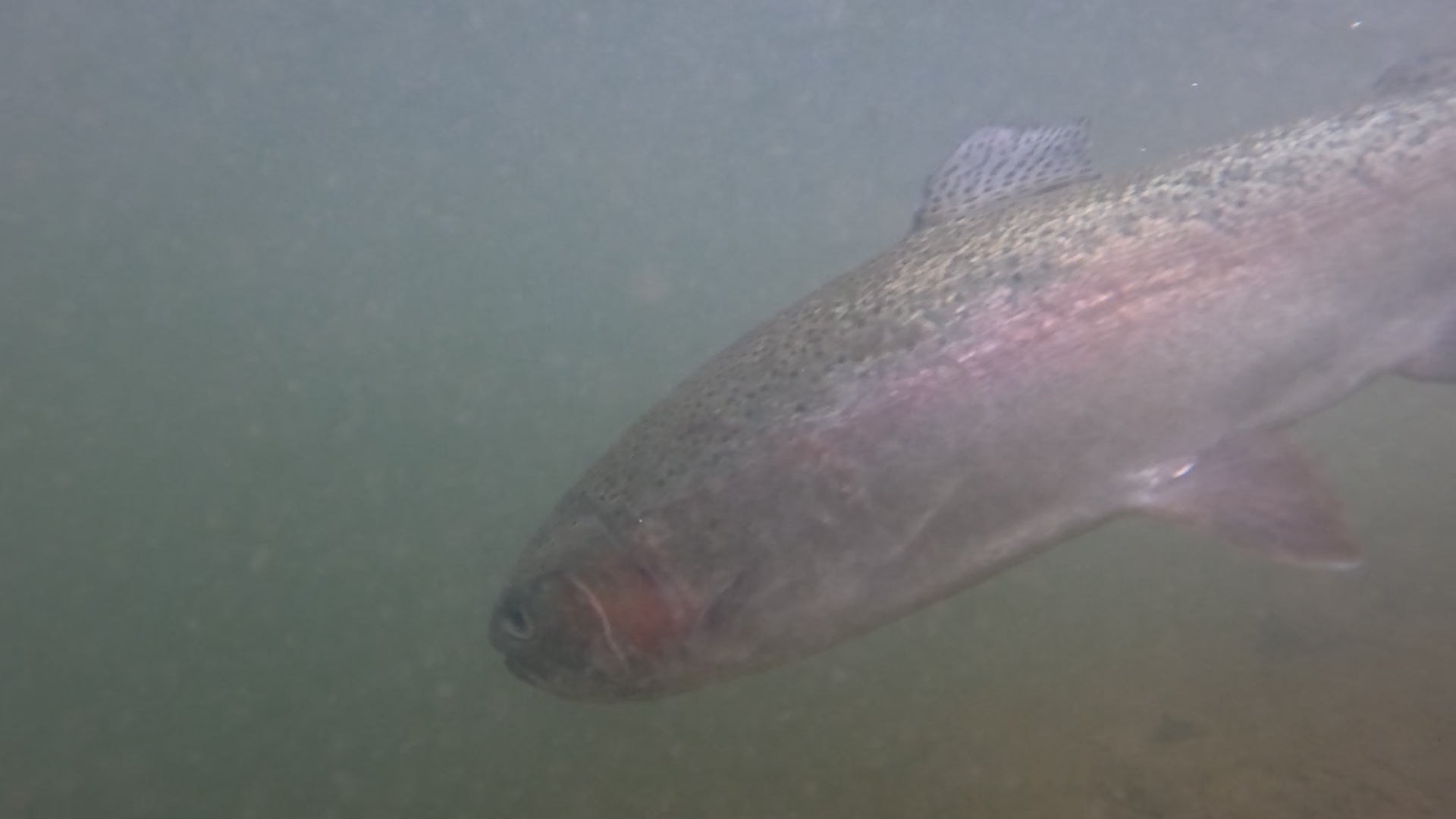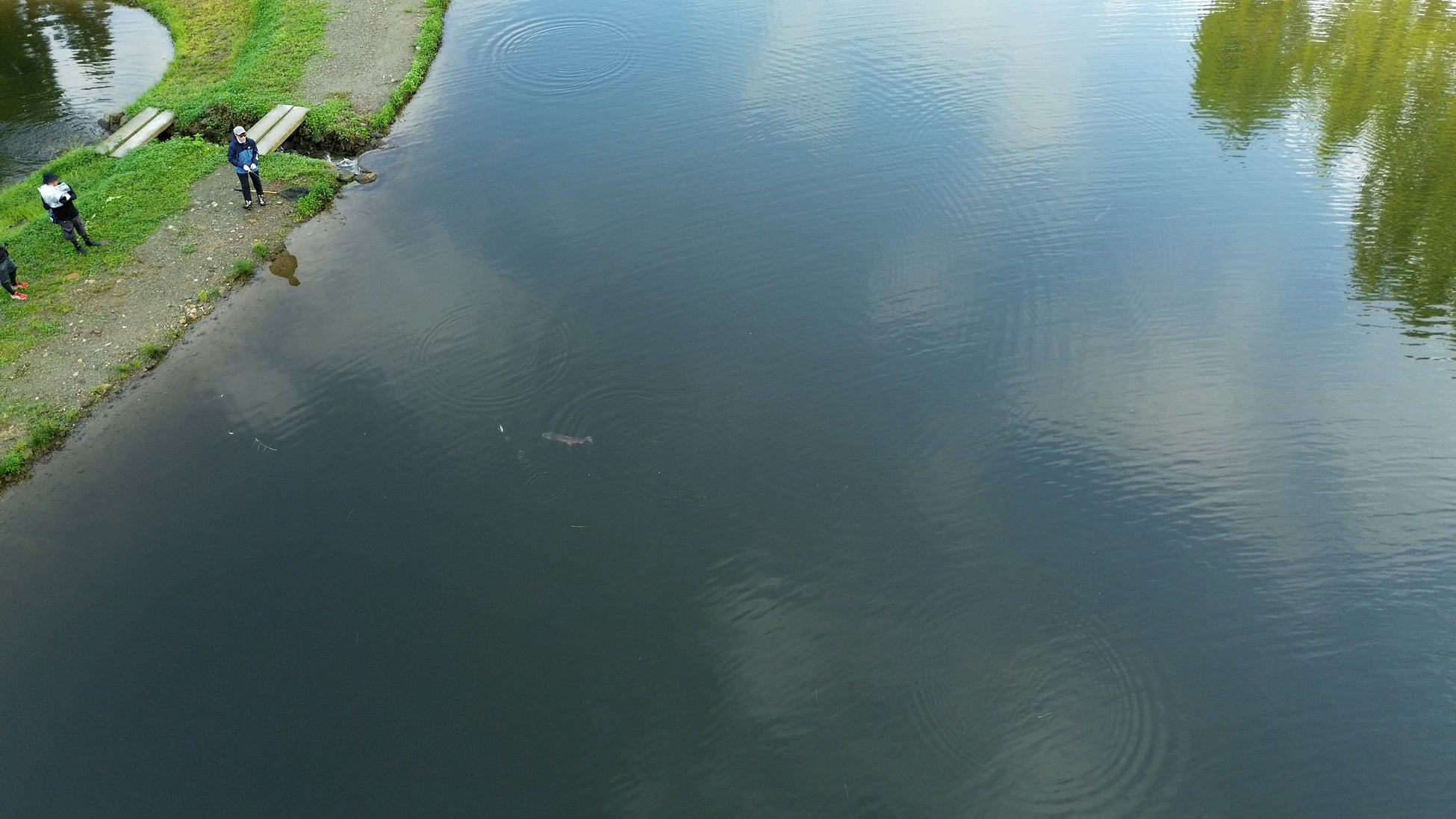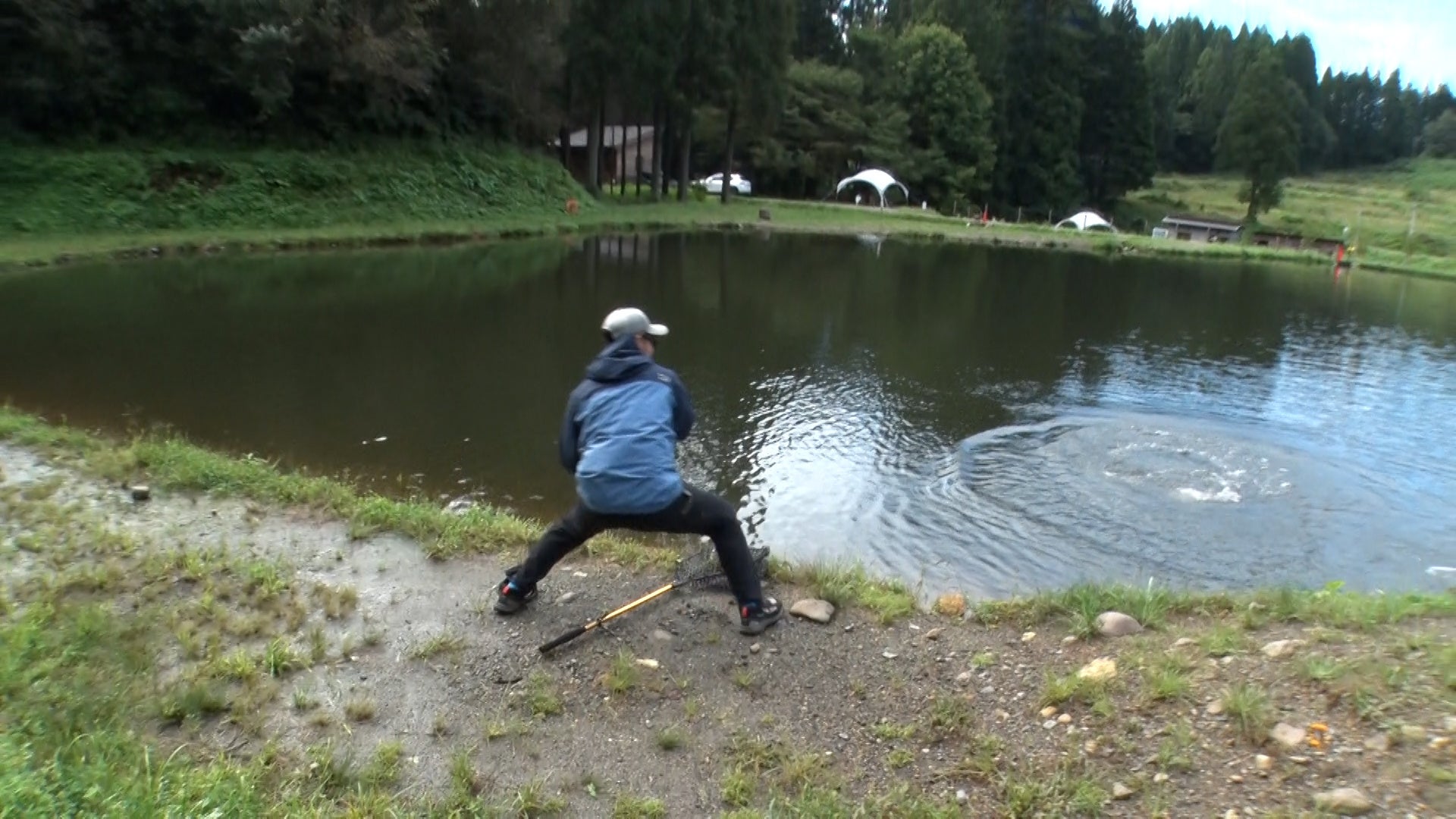 すると、突然“ゴン!”強烈なアタリ。岸際でイトウがヒット!「ヤバイヤバイ!でかい」バレないように足元に引き寄せる。果たしてキャッチ出来るか!?