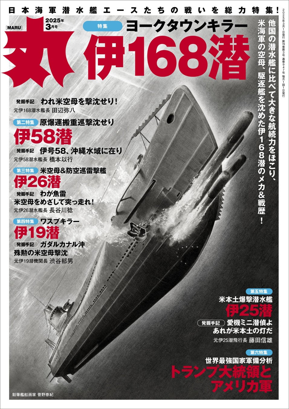 産経新聞グループの潮書房光人新社は、戦史に学ぶ人のミリタリー総合誌、月刊『丸』の3月号を発売しました。特集は「伊号168潜水艦」。ミッドウェー海戦で米空母ヨークタウンを撃沈した殊勲の潜水艦・伊168潜のメカと戦歴を艦長の手記を交えながら徹底解説します。初の試みとして、海中での雄姿を「鉛筆画」で表紙に掲載しました。そのほか、原爆輸送艦を撃沈した伊58潜、米本土空襲を敢行した伊25潜なども紹介。トランプ米大統領の新防衛戦略についても緊急分析します。