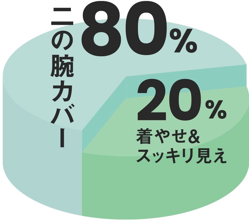 二の腕の気になる部分はしっかりカバーしながら、肘周辺の細く見えるラインをゆったりとした広がりのあるスリーブデザインがきれいに魅せてくれます。脇には当て布が施してあるので、インナーが見える心配もありません。
