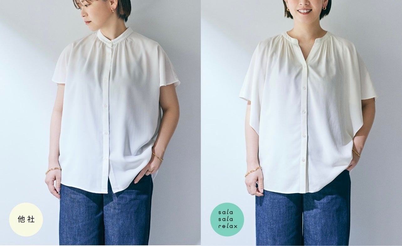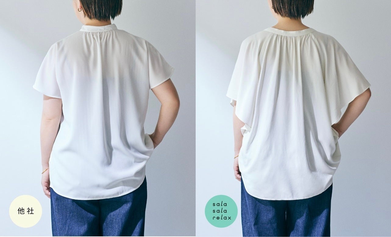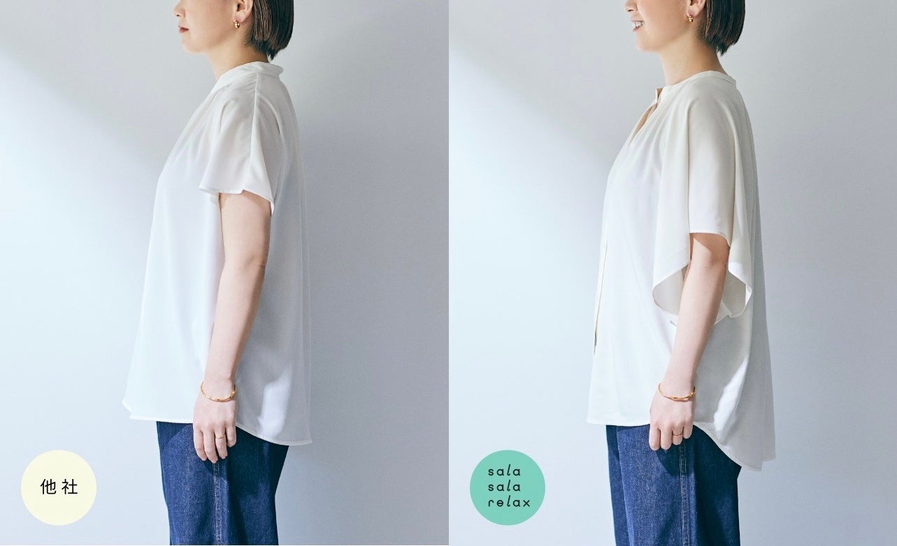 気温が上がって汗ばむ季節になると、洋服が身体にまとわりつき余計に暑苦しく感じたり、どうしても肌の露出が増えて気になる“二の腕”や“身体のライン”をカバーしたくなります。そんな不快な気分を解消するために誕生したのが「さらさらリラックスブラウス」です。女性が気になる部分をしっかりとカバーし、ほどよくゆとりのあるシルエットながらに着やせ効果のあるデザインで幅広い年代の女性から支持を集めています。