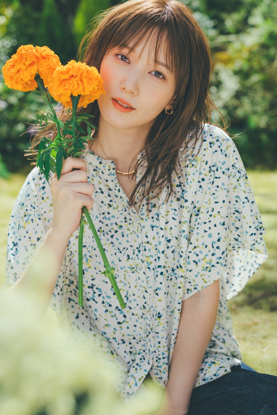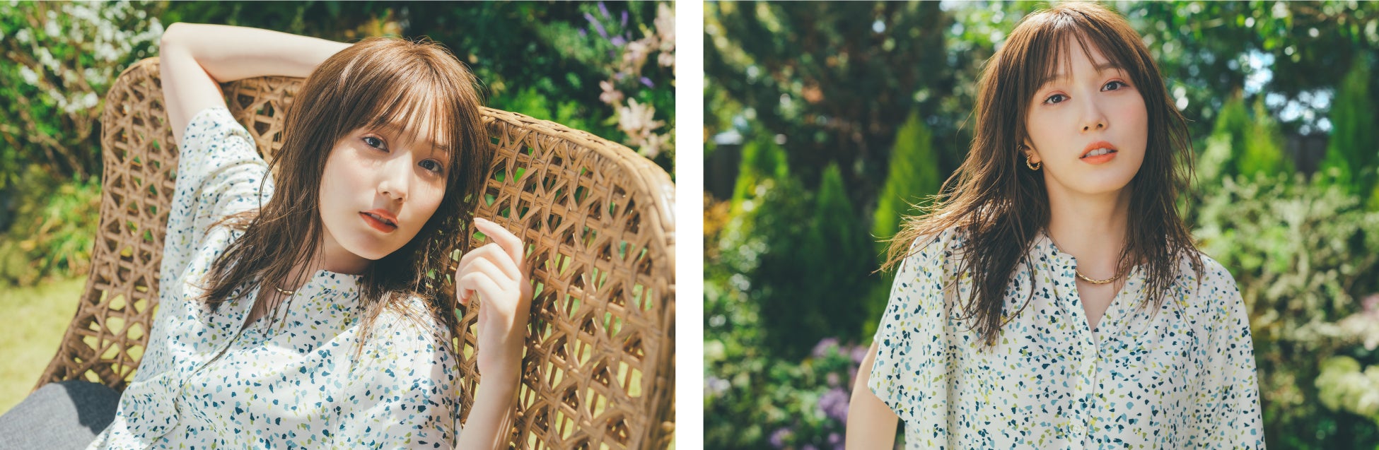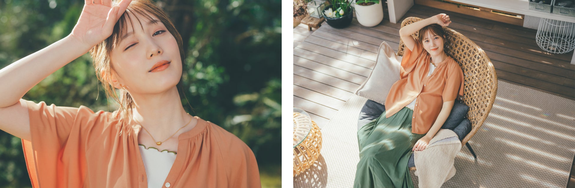 「さらさらリラックスブラウス」を着て花や犬を愛でたり水やりをしたり、リラックスした姿で一足早い夏の訪れを表現!
