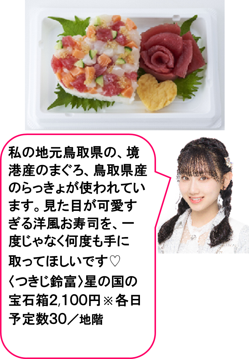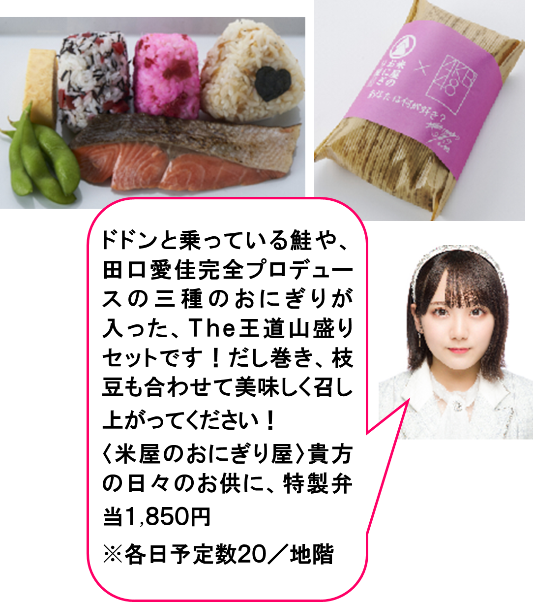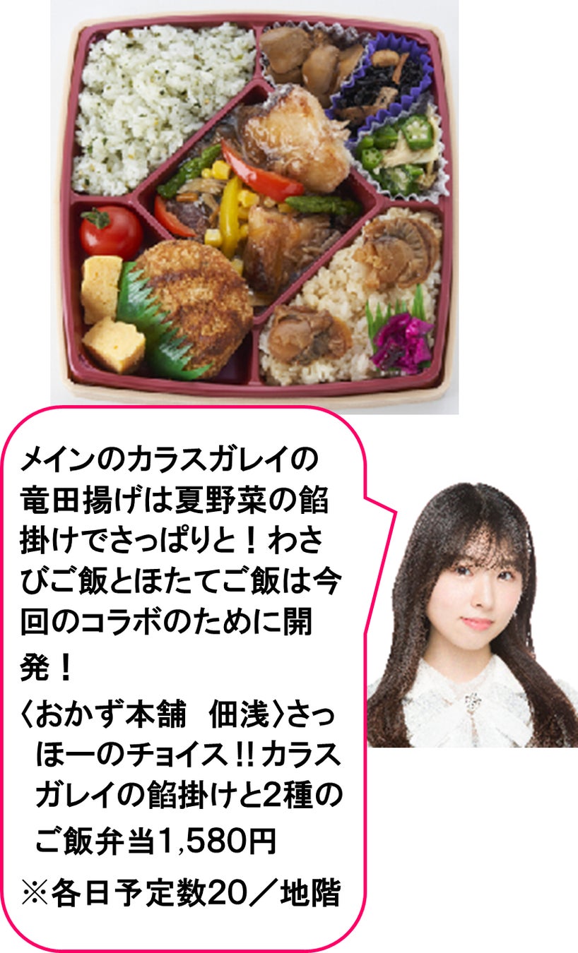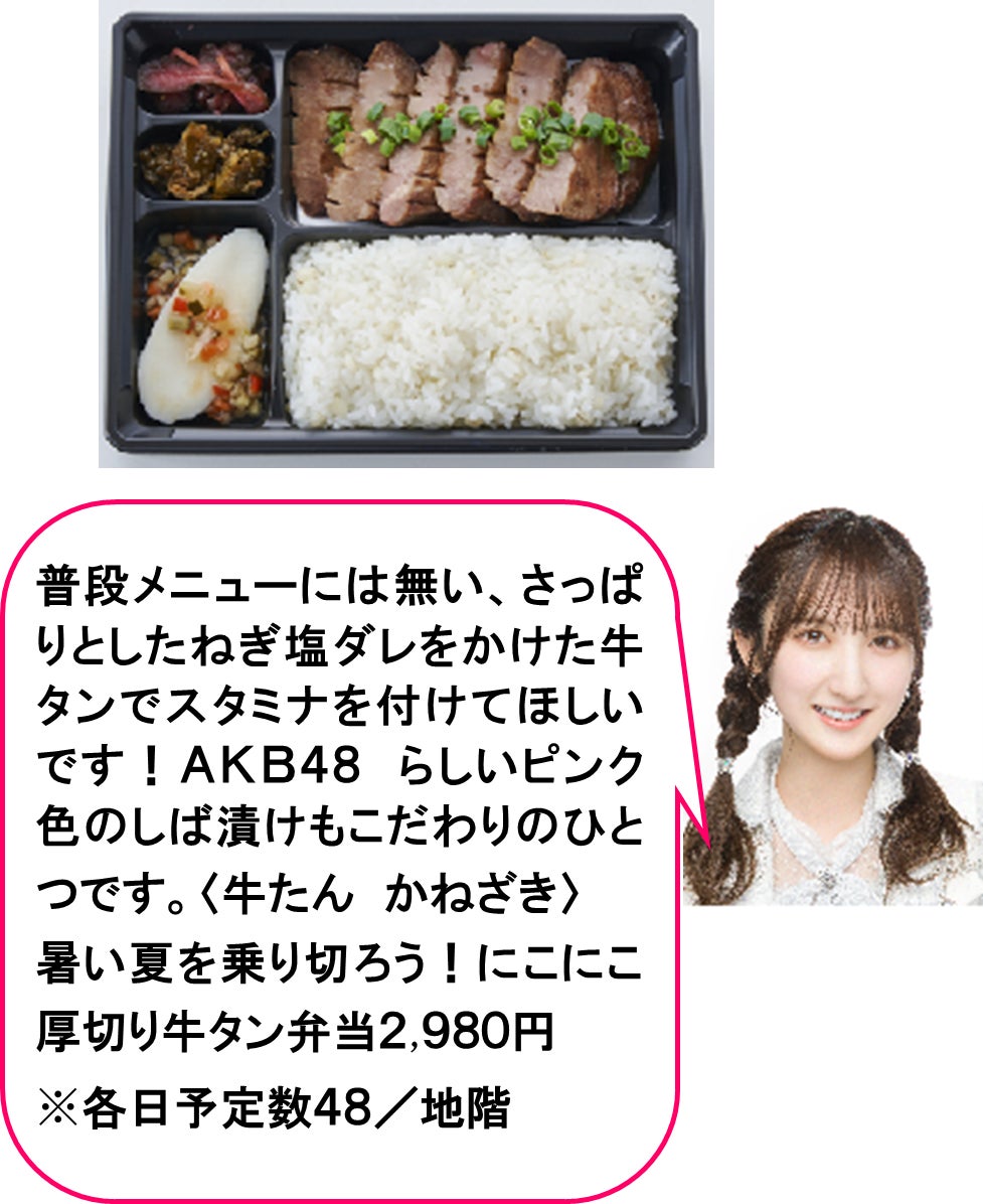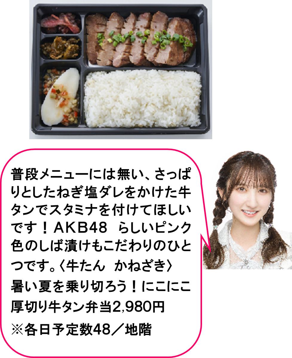 コロナ5類移行後初めての夏休み。東京駅直結の大丸東京店にも多くのお客様が来店されることが予想されます。夏休み期間を盛り上げる施策の一つとして、AKB48メンバーが大丸東京店食品ほっぺタウンの13ショップと考案した今だけしか食べられないメンバーのアイデアやこだわりが詰まったお弁当やスイーツの特別コラボメニュー13点を販売します。コラボ商品お買い上げの方にはステッカー13種類(ランダム)のプレゼントやお弁当のオリジナル掛け紙も実施。※なくなり次第終了 アイドル×百貨店のコラボで夏を盛り上げます。