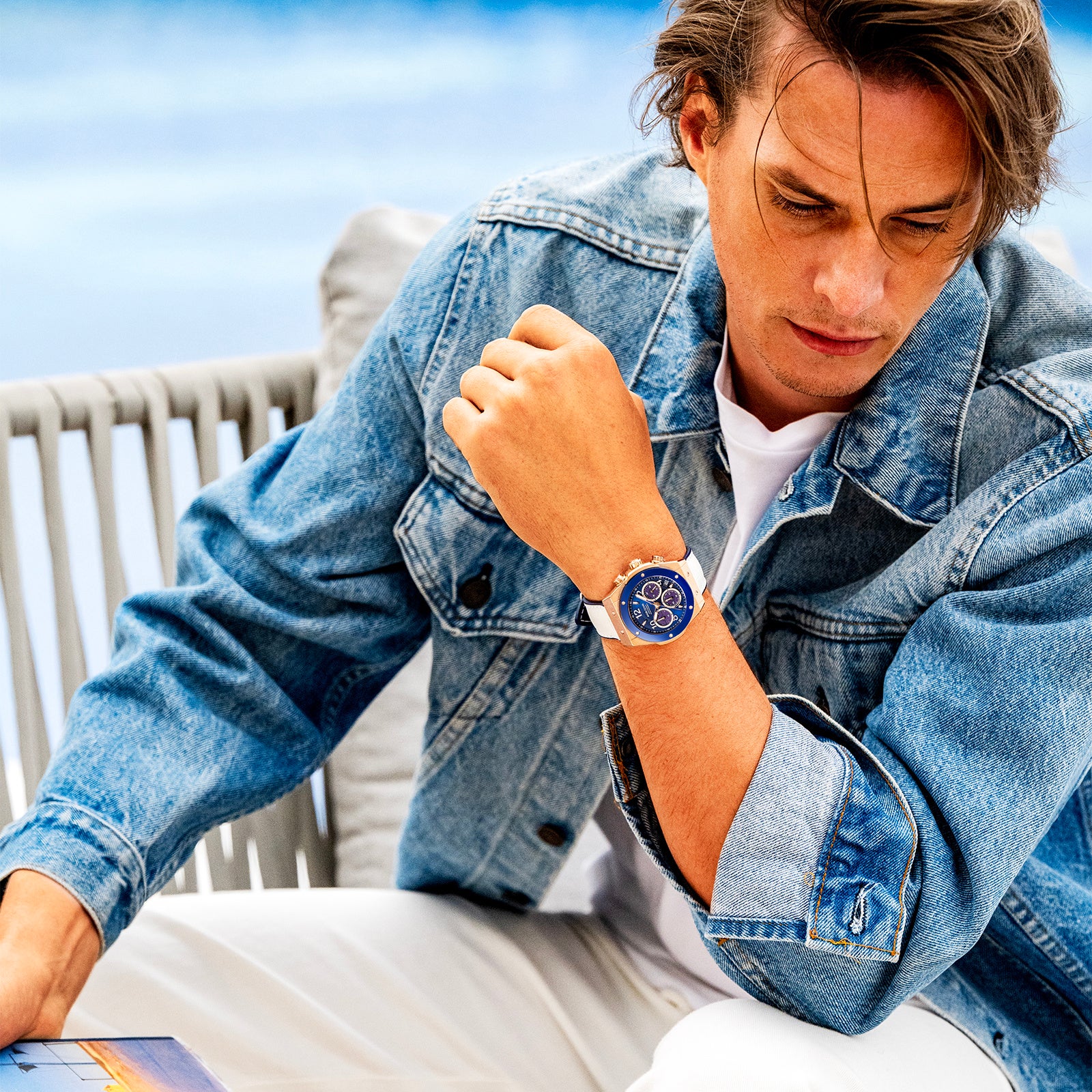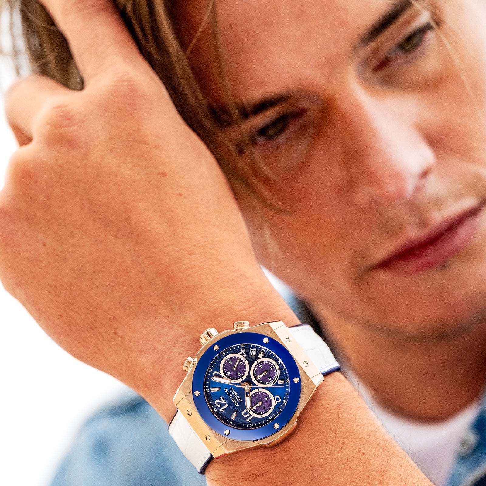 さらにケースにはゴールドカラーを採用。 ブルーやホワイトの爽やかなダイヤルカラーと組み合わさることで、海や空を思わせるリゾートテイストに程よい華やかさをプラスしています。スポーツウォッチのタフさに、ほんのり色気。これが大人の夏時計らしいバランスです。