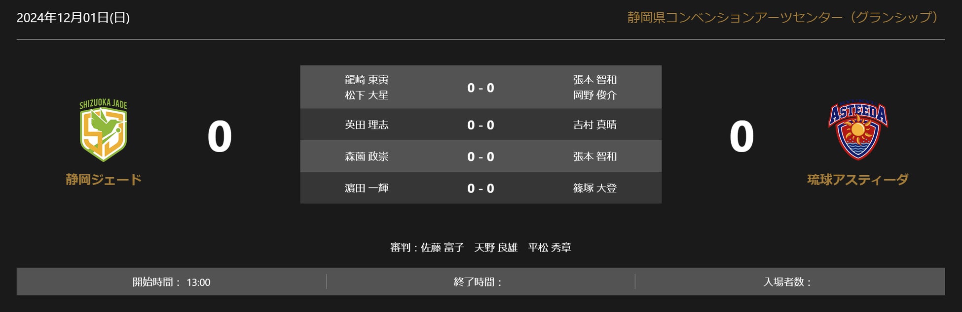 ノジマTリーグ 2024-2025シーズン 公式戦 12月1日開催 静岡ジェード vs 琉球アスティーダ 対戦オーダー発表