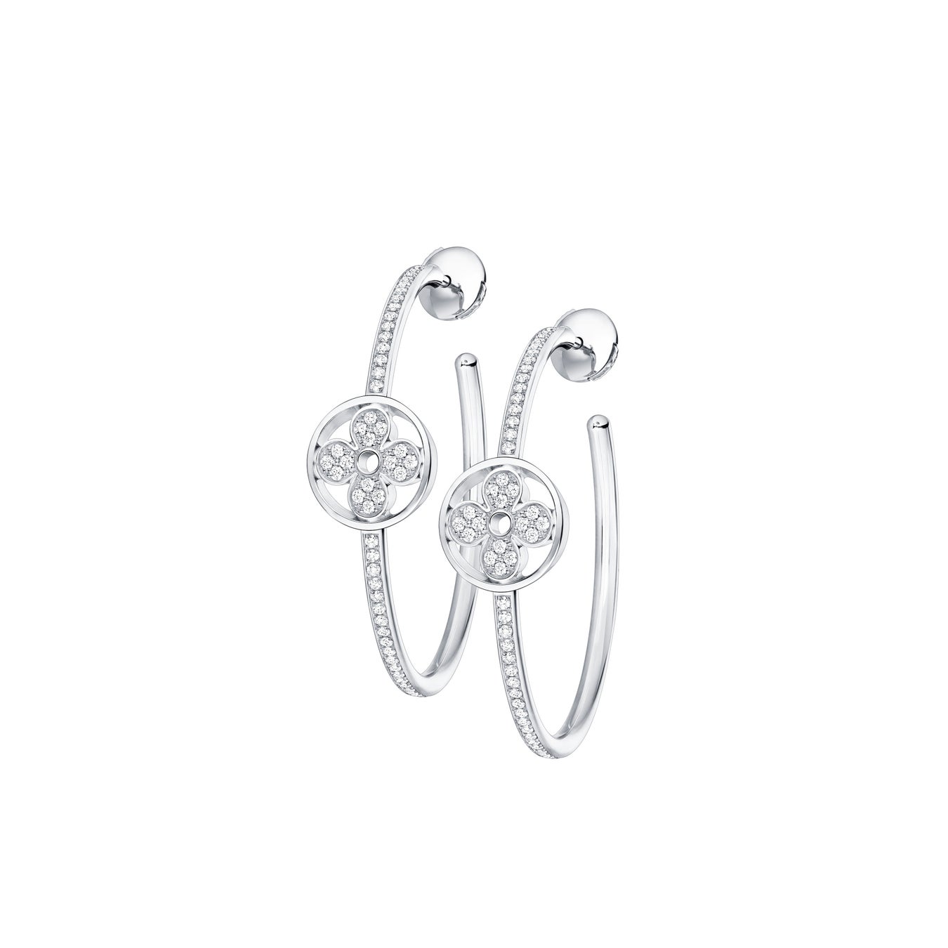 また、メゾンのファインジュエリーコレクション「イディール ブロッサム」より、ホワイトゴールドにダイヤモンドがあしらわれたフープピアスと、「ル ダミエ ドゥ ルイ·ヴィトン」より、ホワイトゴールドとダイヤモンドのリングを着用しました。