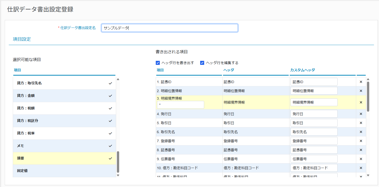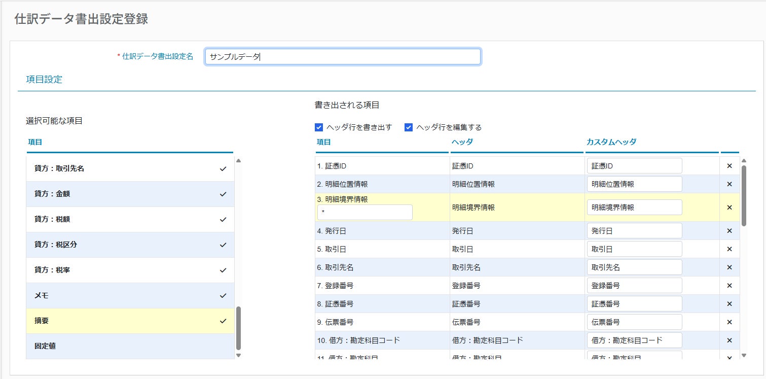 各種会計ソフトでの取り込みに適した形式で、仕訳データのテンプレート作成・CSV出力ができます。出力項目名の変更・選択も可能です。