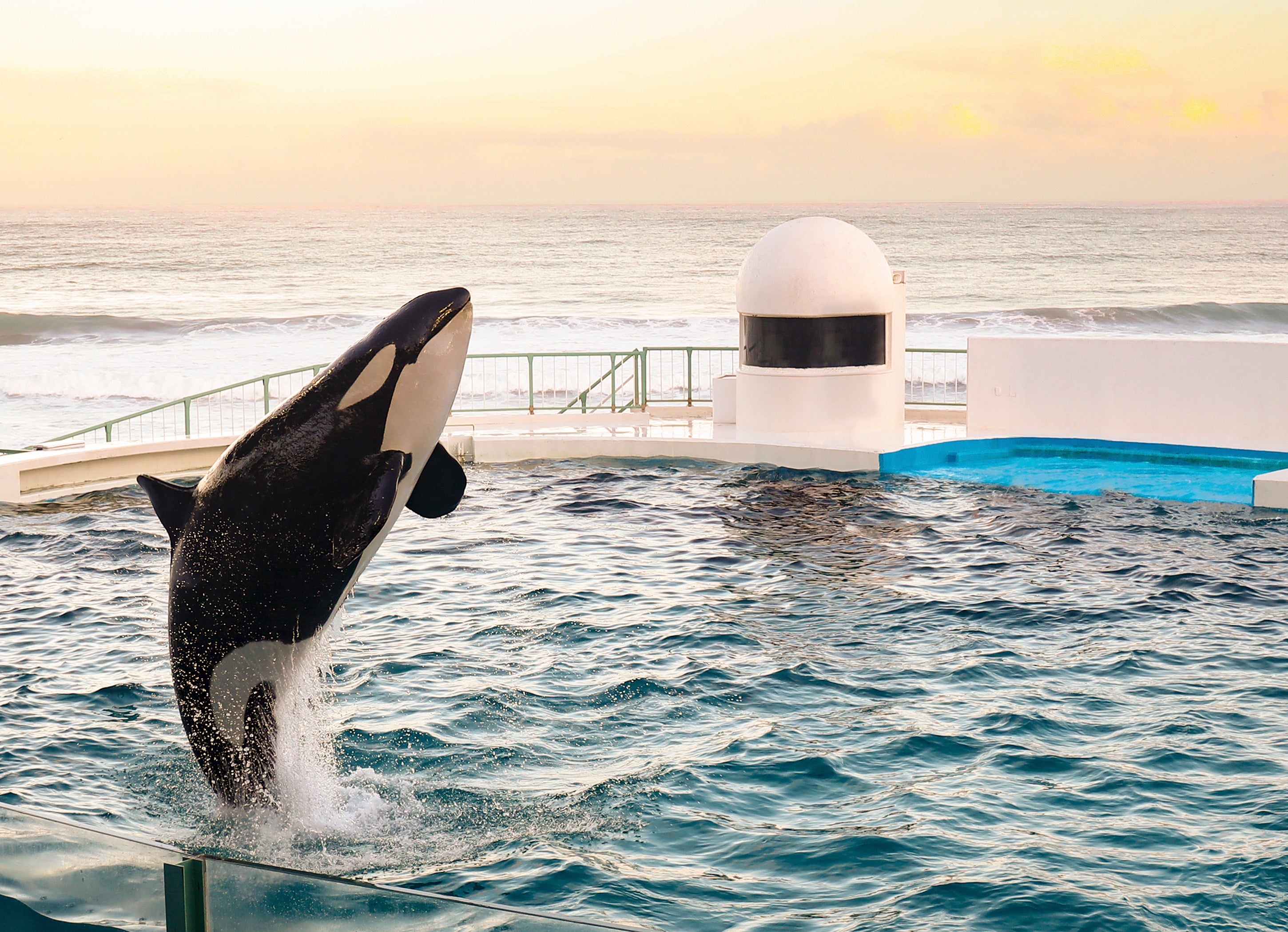 『Special Night with Orca』は、閉館後に行われる特別なシャチパフォーマンスです。日の入り時刻は季節ごとに異なり、鴨川市は4月が18時5分頃、6月が18時55分頃と変化していきます。そのため、開催月ごとに異なる空模様を背景にシャチのダイナミックなジャンプや躍動感あふれる姿をご覧いただけます。