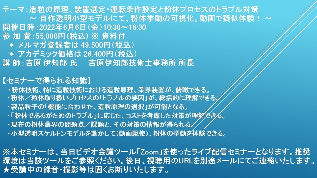 先端技術情報や市場情報を提供している(株)シーエムシー・リサーチ(千代田区神田錦町: https://cmcre.com/ )では、 各種材料・化学品などの市場動向・技術動向のセミナーや書籍発行を行っておりますが、 このたび「造粒の原理、装置選定・運転条件設定と粉体プロセスのトラブル対策 ~ 自作透明小型モデルにて、粉体挙動の可視化。動画で疑似体験! ~」と題するセミナーを、 講師に吉原 伊知郎 氏 吉原伊知郎技術士事務所 所長)をお迎えし、2022年6月6日(月)10:30より、 ZOOMを利用したライブ配信で開催いたします。 受講料は、 一般:55,000円(税込)、 弊社メルマガ会員:49,500円(税込)、 アカデミック価格は26,400円(税込)となっております(資料付)。