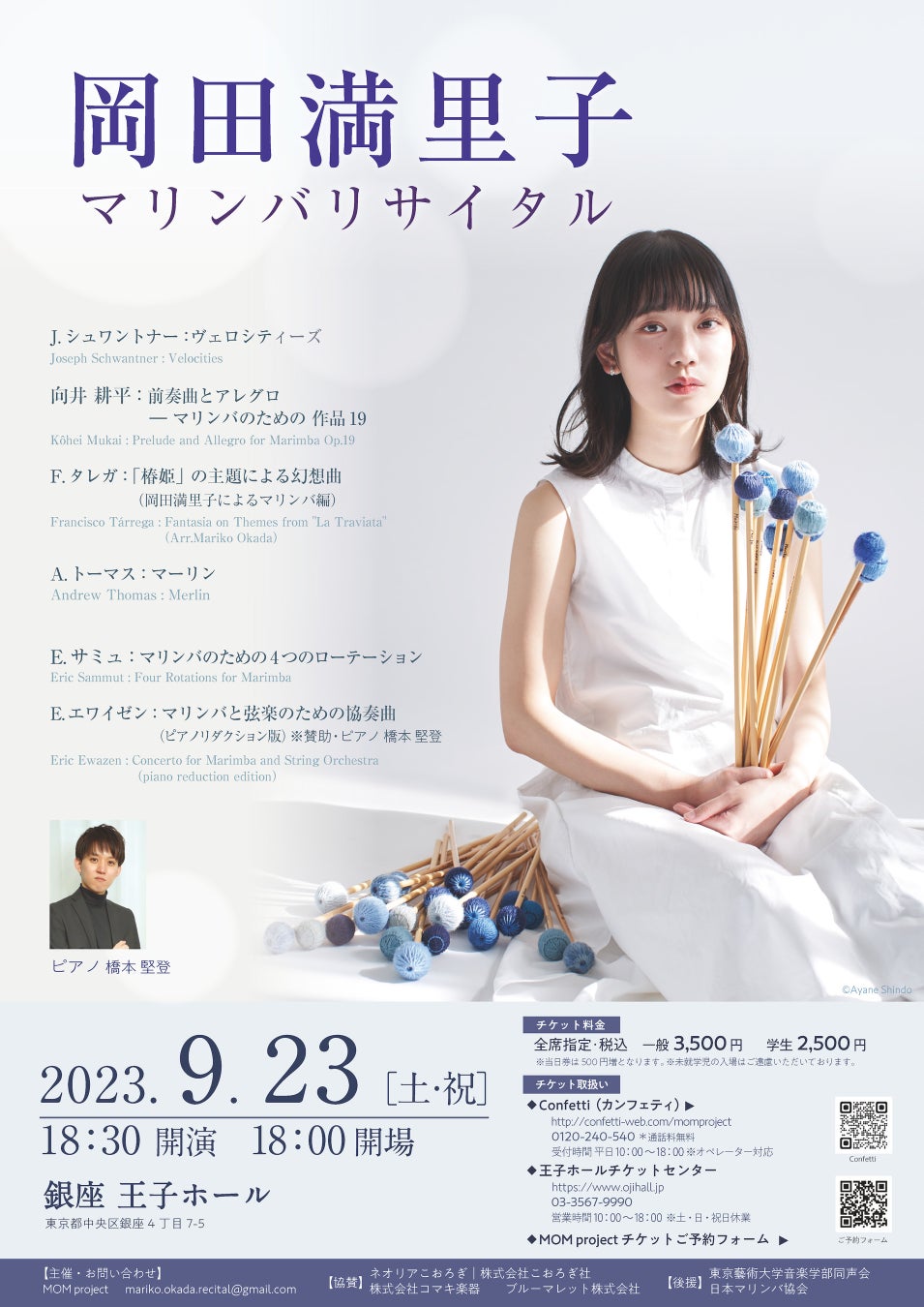 MOM project 主催、『岡田満里子 マリンバリサイタル』が2023年9月23日(土・祝)に銀座 王子ホール(東京都中央区銀座4丁目7-5)にて開催されます。チケットはカンフェティ(運営:ロングランプランニング株式会社、東京都新宿区、代表取締役:榑松 大剛)にて4月1日(土)12:00より発売開始です。
